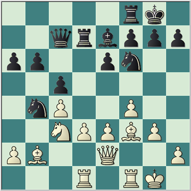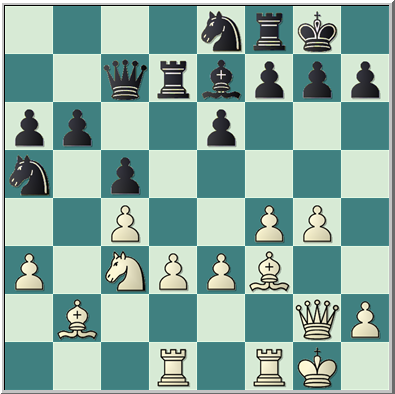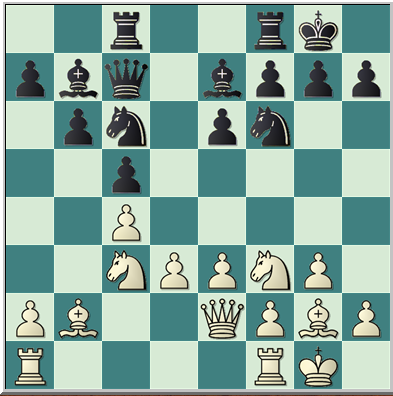 1.c4 e6 2.Cf3 d5 3.b3 Cf6 4.Ab2 Ae7 5.g3 dxc4 6.bxc4 b6 7.Ag2 Ab7 8.0–0 c5 9.e3 0–0 10.d3 Cc6 11.De2 Tc8?! La torre se coloca en la columna “c” para prepararse contra la ruptura d4. Sin embargo el blanco tiene otras ideas muy distintas [11…Dc7 es más flexible, sin definir la colocación de las torres negras]