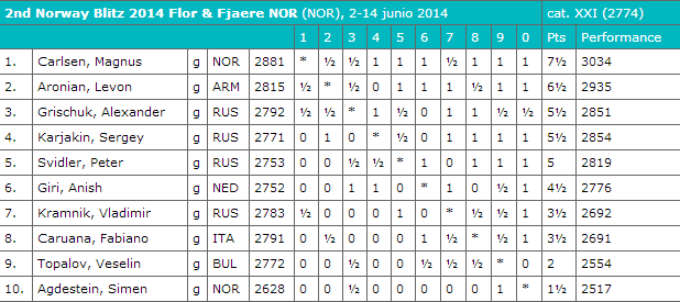 Mañana, día 3 de junio comenzará el evento de partidas clásicas en el cual sale nuevamente como amplio favorito el prodigio noruego. A continuación les dejó la tabla final de posiciones del torneo blitz.