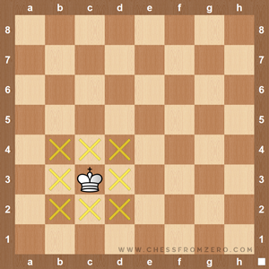 Un rey puede mover una casilla en cualquier dirección (horizontal, vertical o diagonalmente).El rey, naturalmente, puede trasladarse a la que guste de esas ocho casillas. Si no, no sería rey. Puede moverse al cuadro que quiera pero siempre de uno en uno, paso a paso, con la debida majestad solemne.