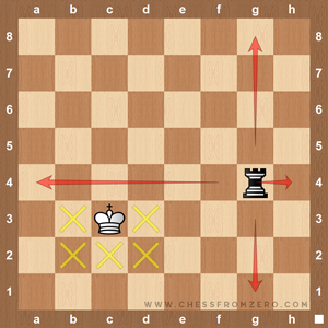 En el segundo diagrama el rey blanco no se puede mover a las casillas “b4”, “c4” o “c4”, porque esas casillas están amenazadas por la torre negra.