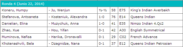 Llego el primer día de descanso y la espectacular china Hou Yifan anda de líder de la prueba con 3.5/4 tras vencer a Zhao Xue. La siguen pisándole los talones con medio punto menos Ju Wenjun, Harika Dronavalli y Nana Dzagnidze. En la parte inferior de la clasificación las trebejistas están teniendo un pobre desempeño, donde 3 jugadoras no han pasado de sumar el equivalente a unas tablas en el primer tercio del torneo.