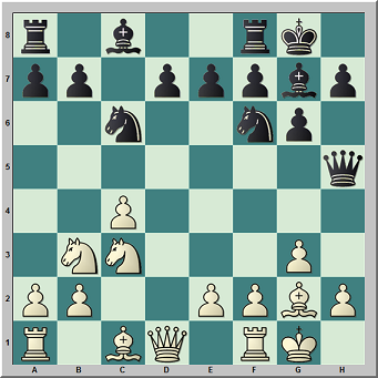 1.Cf3 Cf6 2.c4 c5 3.g3 g6 4.Ag2 Ag7 5.0–0 0–0 6.d4 cxd4 7.Cxd4 Cc6 [7…d5 Una jugada mucho más segura que la de la partida.] 8.Cc3 Da5 9.Cb3 Dh5