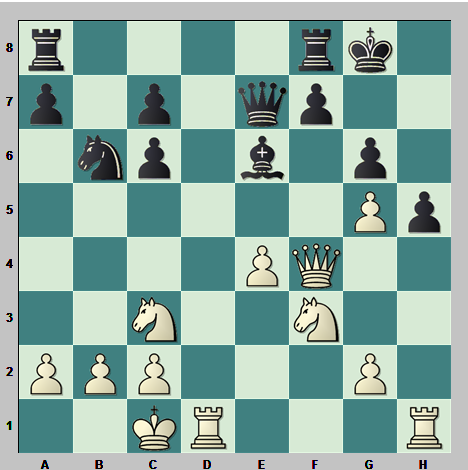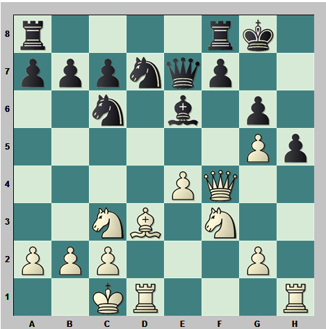 12…De8 la retirada de la dama seguía apoyando el ataque blanco 13.Cd5 Axd5 14.exd5 Cce5 15.The1 y la presión blanca en su ataque sobre la dama rival es fuerte]