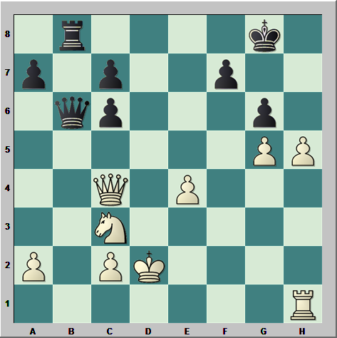 27.Rc1 Td4 28.De2 Dc5 29.Cb1 lo más sencillo 29…Dxg5+ 30.Cd2 y el negro abandonó por su material de menos. El ataque se ha acabado. 1–0